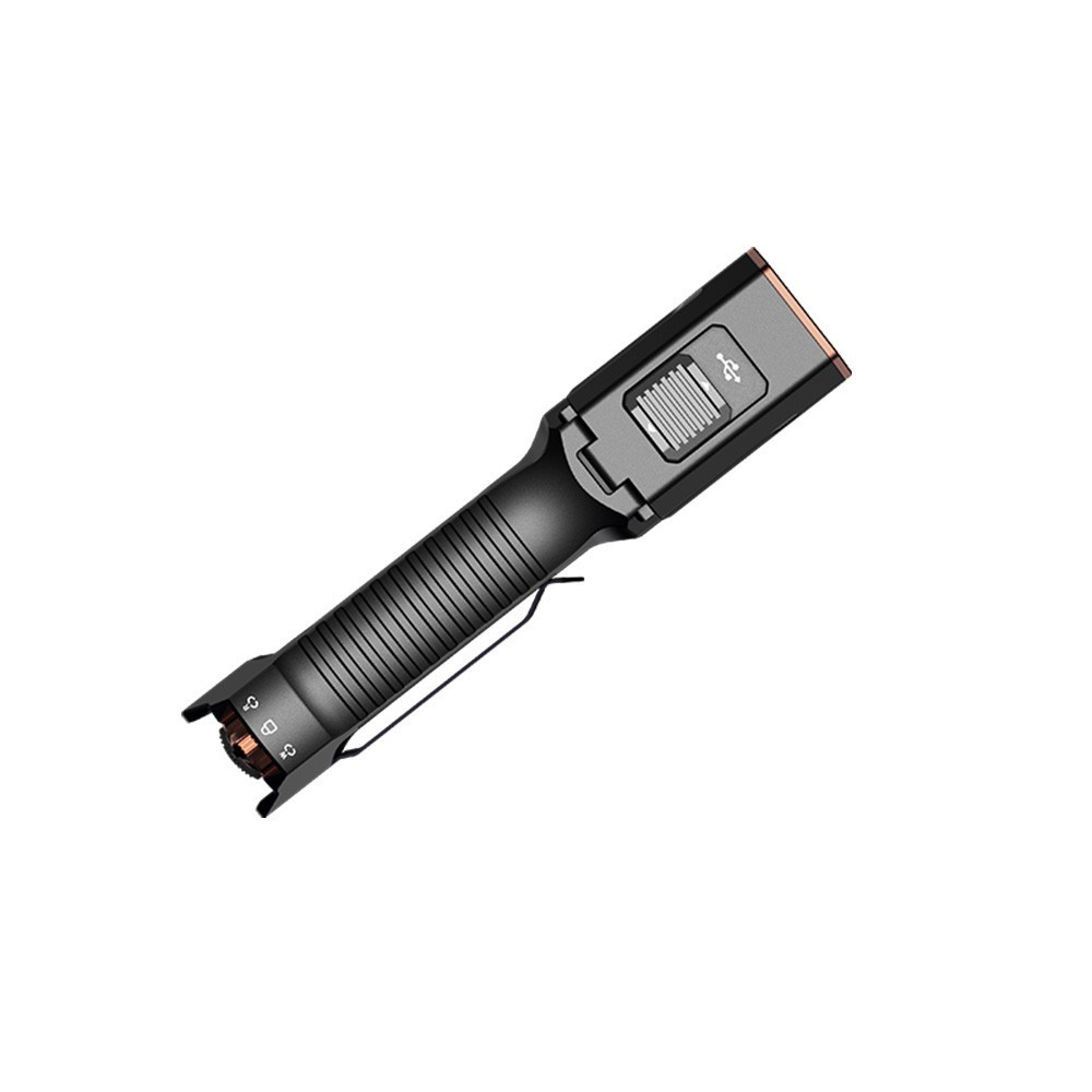 Быстрая зарядка осуществляется за 1,5 часа через порт USB-C. Аккумуляторный отсек оснащен механизмом блокировки, который обеспечивает надежную блокировку отсека в момент использования фонаря. Перед извлечением аккумулятора замок необходимо разомкнуть.