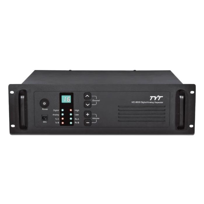Ретранслятор TYT MD-8500 45W TYT MD-8500 представляет собой цифровой ретранслятор со встроенным дуплексером стандарта DMR (ETSI) для диапазона частот UHF (400–470 МГц). Этот ретранслятор предлагает организациям и предприятиям эффективный способ увеличить дальность связи и повысить ёмкость системы в рамках цифровых сетей стандарта DMR. Ретранслятор TYT MD-8500 способен работать в цифровом и аналоговом режимах, обеспечивая дополнительную гибкость при переходе существующих систем на цифровой стандарт связи. Ретрансляторы TYT MD-8500 из профессиональной линейки идеально подходят для силовых структур, экстренных и аварийных служб, промышленных предприятий, компаний топливно-энергетического комплекса и других пользователей, которые ценят надёжную, качественную и гарантированную связь. Функциональные возможности ретранслятора: Мощность. Ретранслятор TYT MD-8500 обладает максимальной мощностью 45 ватт, благодаря чему обеспечивается обширная зона покрытия. Этот ретранслятор увеличивает дистанцию связи между абонентскими и повышает производительность системы радиосвязи в два раза, позволяя поддерживать две одновременные сессии связи. Работа в аналоговом и цифровом режиме. TYT MD-8500 может функционировать как в аналоговом, так и в цифровом режиме, предоставляя максимальную гибкость и комфорт в работе, а также упрощая переход существующих систем на цифровую связь. Встроенный дуплексер. TYT MD-8500 обладает встроенным дуплексером. Дуплексер - устройство, предназначенное для организации дуплексной радиосвязи с использованием одной общей антенны как для приёма, так и для передачи. Питание. Ретранслятор TYT MD-8500 обладает возможностью работы как от сети 220 В, так и от источника питания 13,8 В. Дисплей. Ретранслятор TYT MD-8500 оснащён информативным дисплеем, который позволяет отслеживать такие параметры, как мощность, состояние ретранслятора (включён или выключен), цифровой и аналоговый режимы, а также статус приёмника и передатчика для каждого слота и номера канала. Динамик. Ретранслятор TYT MD-8500 оснащён динамиком в передней части, благодаря которому его можно использовать в качестве базовой станции. Ретранслятор обеспечивает: Возможность круглосуточной работы со 100% нагрузкой и мощностью 25–45 Вт. Одновременная поддержка двух каналов передачи речи или данных в цифровом режиме TDMA Встроенный источник питания. Поддержка аналогового и цифрового режимов. Яркие и четкие цветные светодиодные индикаторы режима работы. Индикаторы показывают режимы приема и передачи в обоих временных интервалах. Прочные ручки упрощают установку и перемещение. Характеристики: Число каналов памяти: 99 Диапазон частот, МГц: UHF (400-470) Шаг частот: 12.5/25 kHz Питание: 220 B ± 10%, или 13.8 B Температурный режим работы: - 30 - + 60 °С Габариты: 115 х 325 х 391.5 мм Вес: 11 кг Максимальная мощность: 45 Ватт Модуляция: 16K0F3E / 11K0F3E Комплект поставки: Ретранслятор - 1 шт. Кабель питания с евровилкой для подключения к сети 220V Кабель для программирования - 1 шт. Инструкция на английском языке.